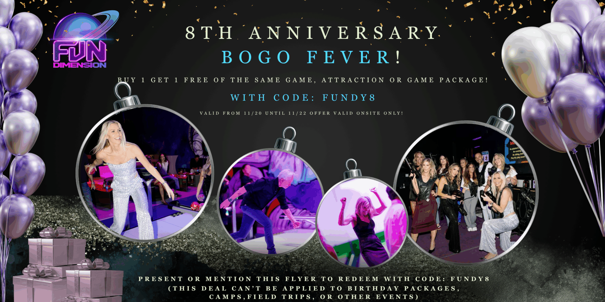 🎉 FunDimension Anniversary BOGO Fever! 🎉 Buy 1, Get 1 Free — Three Days Only! Celebrate our anniversary with double the fun! From November 20th to November 22nd, enjoy an exclusive BOGO special on any game, attraction, or package at FunDimension. ✨ How It Works Purchase any game, attraction, or package onsite and get a ...