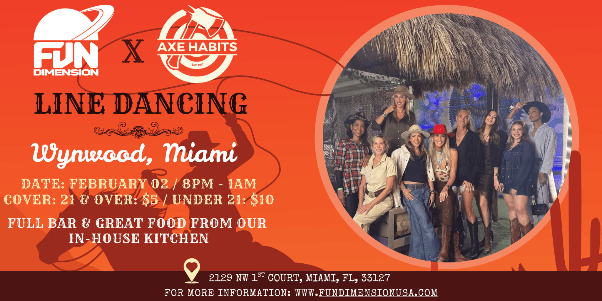 FunDimension 2129 NW 1st Court, Miami, FL, United StatesLine Dancing At FunDimension! Grab your boots, feel the rhythm, and join us for a high-energy evening where the music doesn’t stop and the dance floor stays alive all night long. Great music, great company, a full bar, and delicious food from our in-house kitchen await! Date: February 02 Time: 8:00 PM – 1:00 AM ...