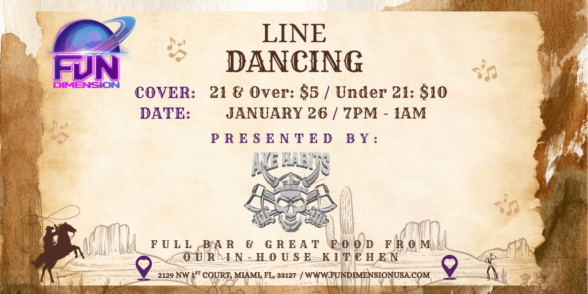 FunDimension 2129 NW 1st Court, Miami, FL, United StatesLine dancing hits FunDimension for the first time! We’re excited to bring you a special collaboration with Axe Habits for an unforgettable Line Dancing Night. Grab your boots, feel the rhythm, and join us for a high-energy evening where the music doesn’t stop and the dance floor stays alive all night long. Great music, great company, a full ...